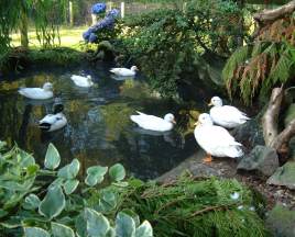 Having placed a wooden open ended barrel inside to provide shelter all that was necessary was to install the ducks. This is now a place where we spend some pleasant moments just watching with a cup of tea on a warm summer morning smiling often as we watch these little ducks go about their daily routine. Equally they lift your spirits on a damp winter afternoon. They always oblige with the antics they are famous for. Even on moonlit nights they are always busy doing something.