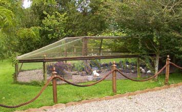 To provide shade and colour the inside was planted with non poisonous (no berries) evergreen shrubs, primroses in the rockeries for spring and pansies for summer. Other plants in pots are placed inside according to the season. The whole of the ground area is covered in pea shingle which is free draining, easily washed down with a garden hose and raked out to maintain cleanliness. The ducks find this very comfortable underfoot.